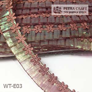 เนื้อเทปสอดดิ้นประกายรุ้ง ด้านจีบติดแนวดอกไม้อัดพิมพ์ จีบระบายแบบ twist สวยงาม